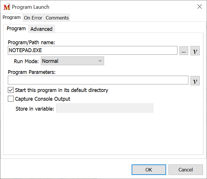 The Program Launch command instructs the macro to start a specific program. If the program cannot be found, the macro terminates. This option may not display the launched program on top of other programs currently running. To ensure that the program window opens at program launch, use the Launch Program and Activate Window command.