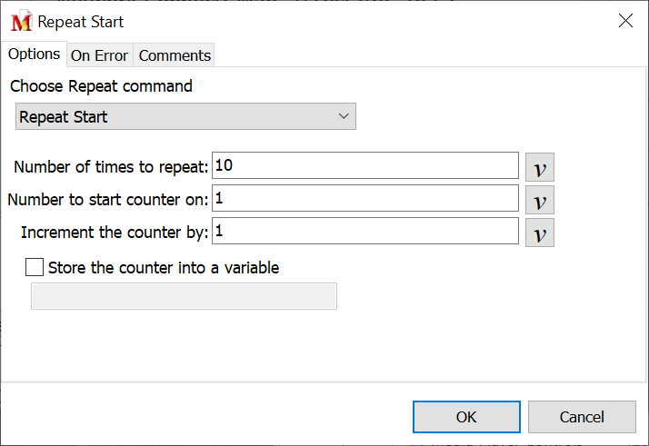 For the Start Repeat, Start Repeat with Prompt and Start Repeat with Variable commands, optionally place the repeat counter into a variable so that the counter value can be used and manipulated during the repeat process.