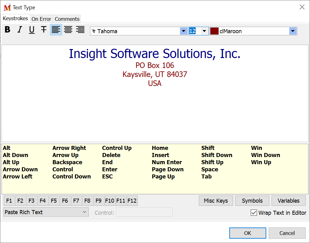 Macro Express Pro has the ability to play back text in a rich text format. Select the Paste Rich Text option from the drop down menu to display the rich text editor options. Create the rich text content directly in the Text Type command or copy the rich text from another source and paste it into the edit box.
