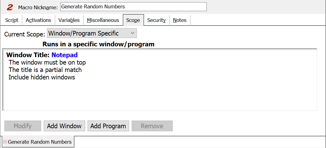 Scope essentially refers to which program or programs allow the macro to activate. The default setting is Global for each new macro created. Choose to have the macro run in all applications, limit it to specific programs or windows, or have it play back in all windows and programs except for the ones specified.
