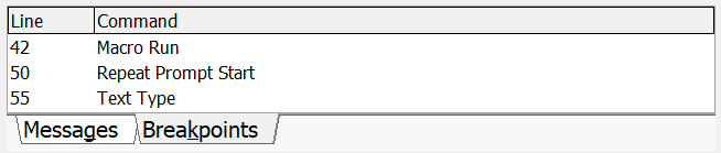 This tab displays any breakpoints that were defined in the macro for debugging purposes. The line in the script and the command with the breakpoint are displayed.