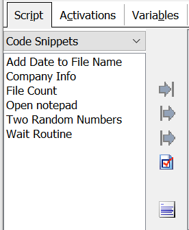 Highlight the Code Snippet to use and click on one of the green insert buttons to insert the snippet into the script. The Macro Script Navigation topic below defines where in the script the snippet will be placed.