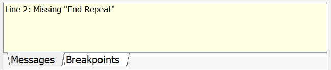 Any syntax errors or other problems with the macro are displayed in the Messages tab when saving a macro. This tab will alert you to potential problems with the macro script, such as having a Repeat Start command without a matching Repeat End, or an If command without a matching End If.