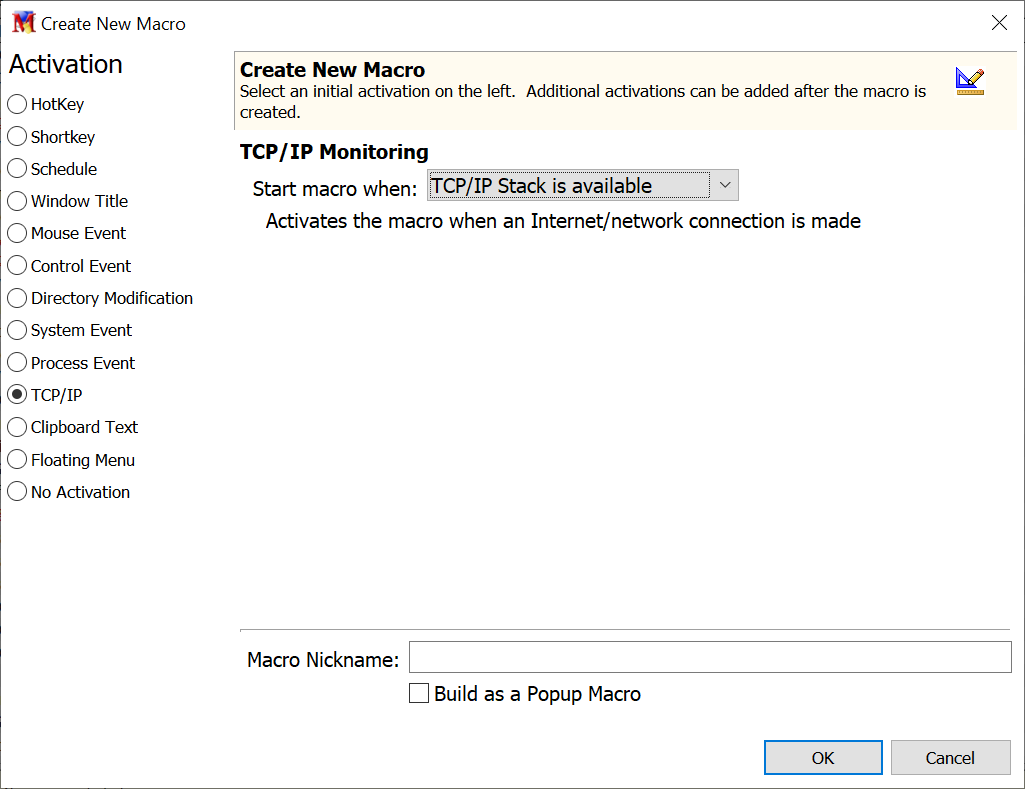 The TCP/IP activation monitors when an Internet or Network connection has been made or released.