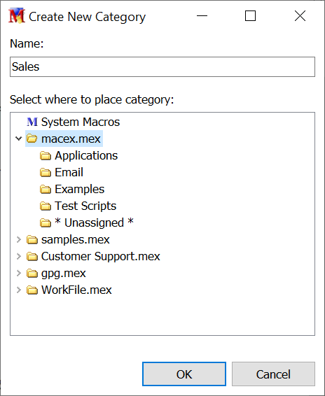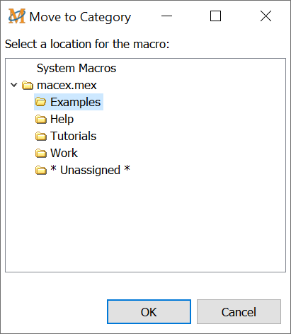 Highlight the macro to be assigned and click on Macros > Move to Category to display a list of categories such as in the example below. Choose the category to move the macro into and press the OK button. The macro is now assigned to the category selected.