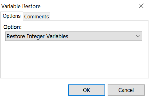 The Variable Restore command restores values of variables from system memory. Select to restore all variables or a specific variable type, such as Text String, Control, Integer, etc.
