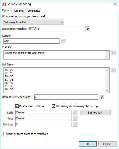 This feature is available for the following Variable Set String options: Set Value Now, Set Value from Clipboard, Set Value from File, Set Value from INI File, Set from Environment Variable and Set Value from List.