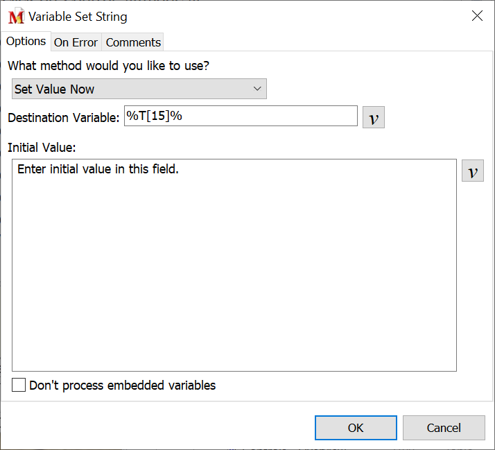 For example, select %T[15]% as the destination variable and insert %sample% in the Initial Value field. When the "Don't process embedded variables" option is selected %sample% will be stored in variable %T[15]% as %sample% rather than the expanded value of the variable.