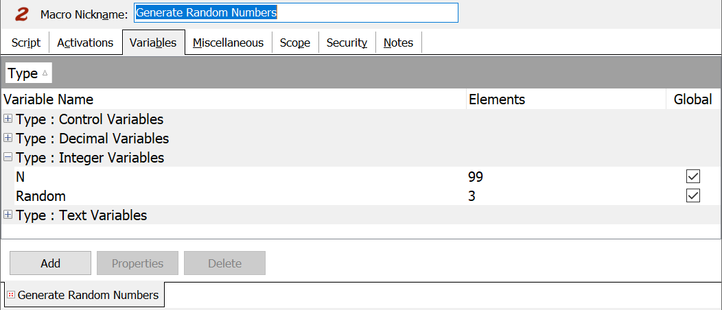 Click on the Add button to create a new variable for use in the macro. The Variable Properties window, as shown above, opens for generating new variables. This option does not allow for assigning values to a variable. Use this function to create the variable name and type. Use the Variable commands to assign values to variables.