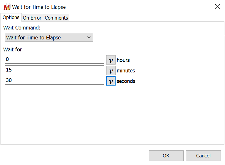 ❖Warning: By putting Macro Express into this wait condition, access to Macro Express functions is not available, including stopping the macro until the specified time has elapsed. Use this command with caution.